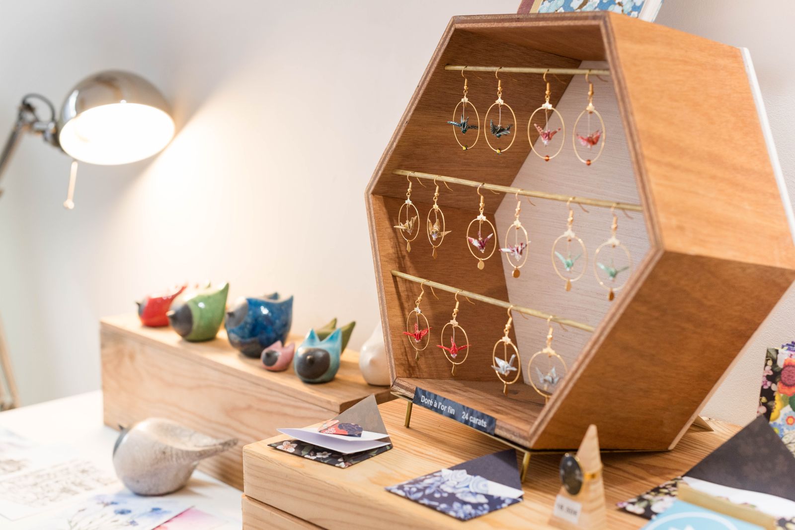 Toutes les créations sont réalisées sur place avec en prime l'opportunité d'admirer l'artisan d'art travailler dans son atelier sur place. Elle complète son offre par des créations artisanales de la région, dans l'univers du papier et du Japon. Elle propose également la réalisation de créations sur mesure et la personnalisation. Les boucles d'oreilles sont ajustables sur clips pour oreilles non percées.