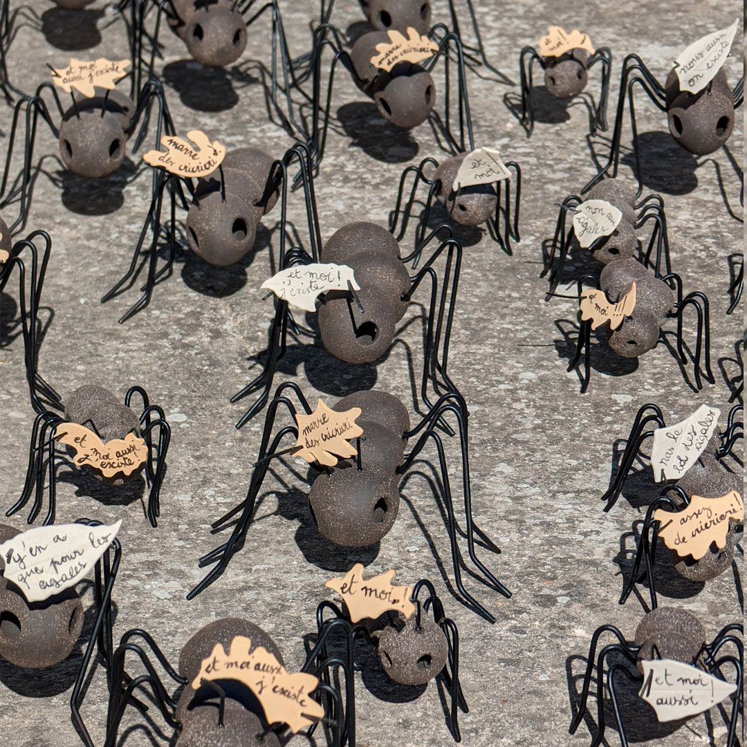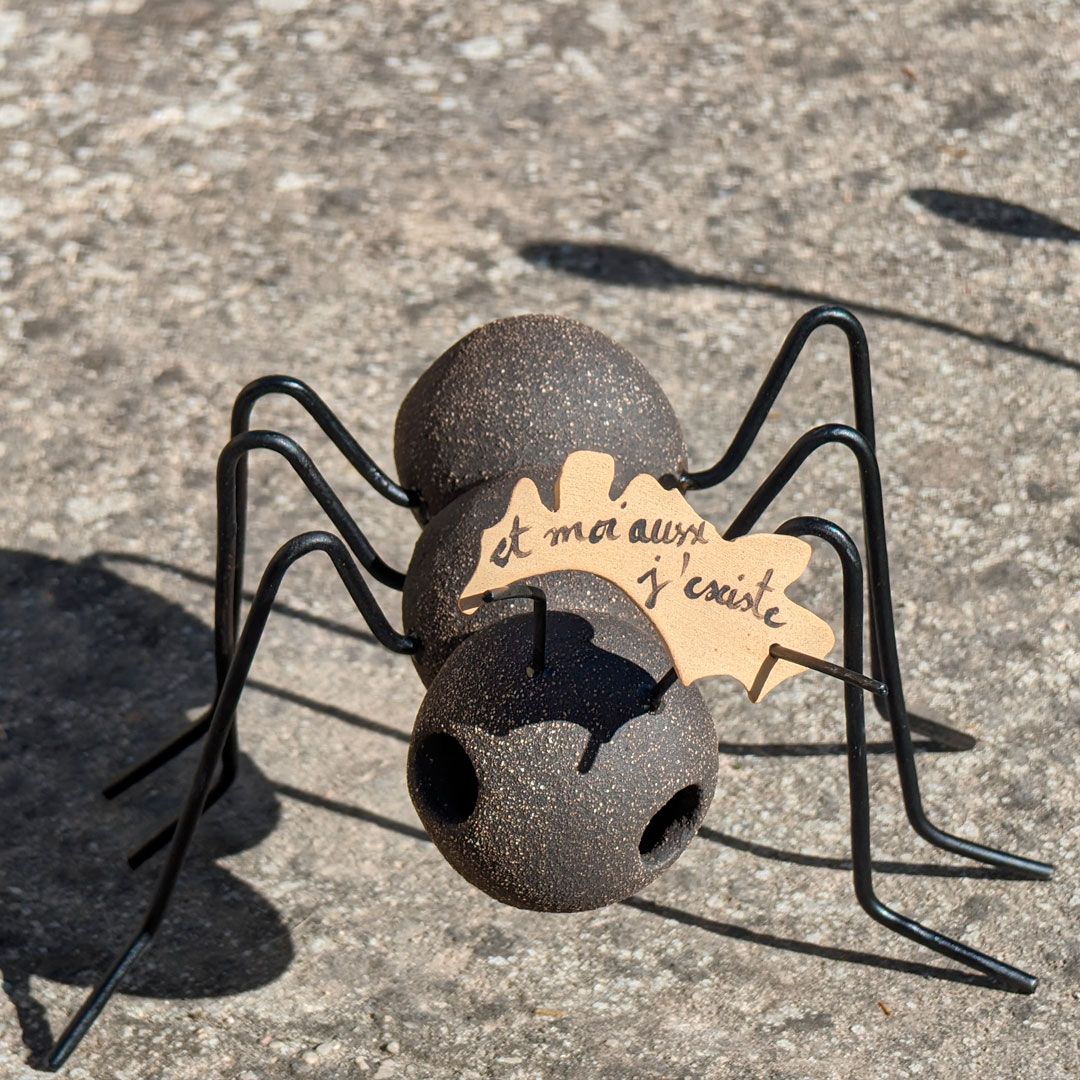Choisir les supports et les matières en fonction de l’histoire à raconter… L’argile (grès ou la faïence) est le départ et se lie avec du bois, du fil de fer, du crochet… Unicité ou série, noir et blanc ou couleurs. Point central de la réflexion de l’amusement et de l’expérimentation plastiques et graphiques : l’homme la femme et leurs animaux de compagnie ou de non-compagnie, de la figuration, des écarts de pensée, des associations d’idées de formes et de couleurs…