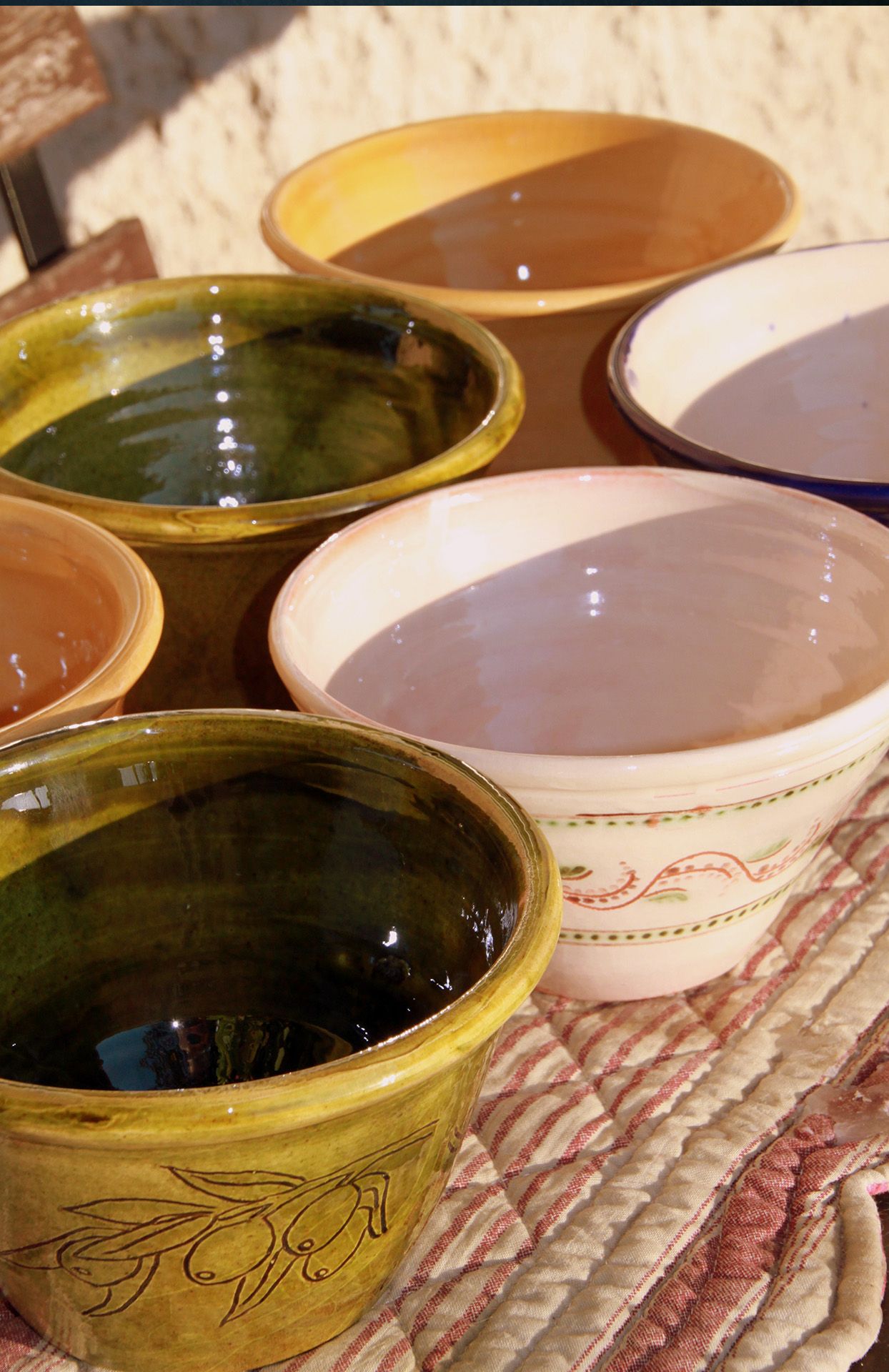 À mon tour le partage est celui de faire voir aux clients toutes les étapes de l'élaboration des objets qu'ils choisissent, en intégrant l'espace de vente au coeur de l'atelier de fabrication, en étant à leur écoute et en répondant à leurs questions. Alors, quand ils toucheront chez eux l'objet ramené, ils auront aussi une histoire, un peu d'âme de l'atelier et de la Provence. Chaque pièce est unique, ils reconnaîtront l'impact de la main sur la pièce dans ses petits défauts qui n'en sont pas.
