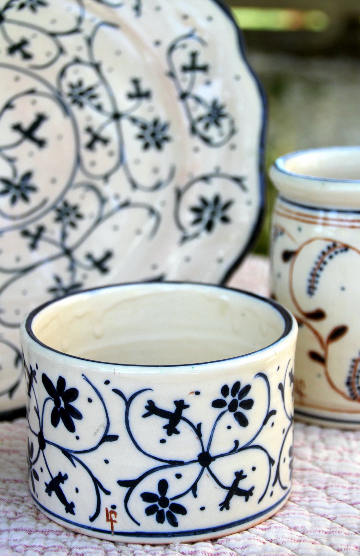 Tout d'abord, une histoire familiale avec un arrière grand-père "malonier" dans le Var à Salernes, puis à Marseille. J'ai donc baigné dans le goût de la poterie provençale et de toute la culture allant avec. Je suis profondément attachée à mes racines et à ma région. Ma vie est ici, et l'exercice de ce métier modeste est ma contribution, sans prétention, au maintien d'une activité séculaire traditionnelle.