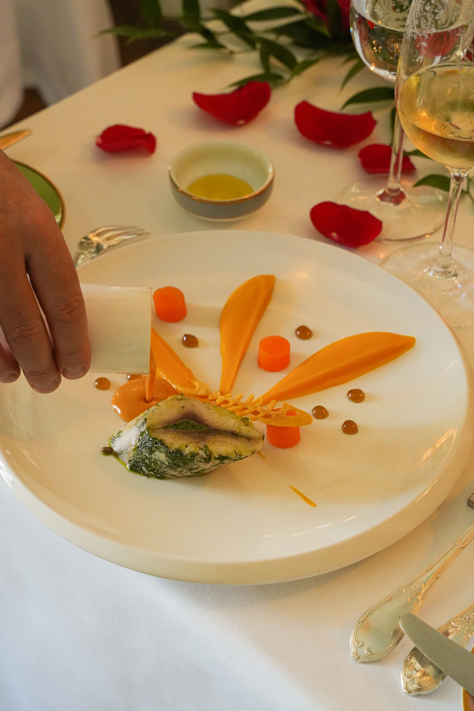 Installez-vous d’abord en terrasse, à l’ombre de majestueux platanes. Avec son charme évoquant un patio florentin, la terrasse vous plonge dans une atmosphère élégante et bucolique, loin de l’effervescence de la cité du Roi René. À la tombée de la nuit, les tables s’illuminent de mille bougies, ajoutant une touche féérique à chaque plat délicatement présenté.